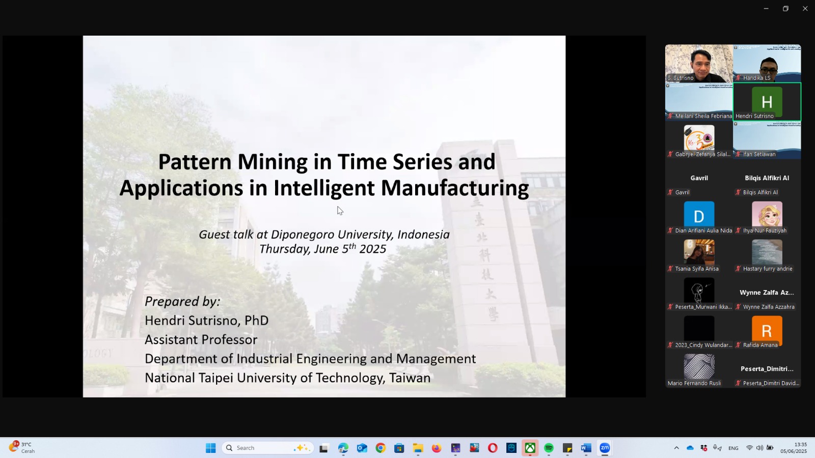 To introduce this topic, the Department of Mathematics at the Faculty of Science and Mathematics, Diponegoro University, held an online guest lecture titled “Pattern Mining in Time Series and Applications in Intelligent Manufacturing” via the Zoom platform on Thursday, June 5, 2025. The event featured Dr. Hendri Sutrisno from the Department of Industrial Engineering and Management, National Taipei University of Technology, Taiwan, as the speaker. The session started at 1:00 PM WIB and lasted for approximately three hours. The material presentation and discussion were led by Dr. Sutrisno, with moderation by a Mathematics Department lecturer from Diponegoro University. Around 180 participants attended and actively engaged in the event.