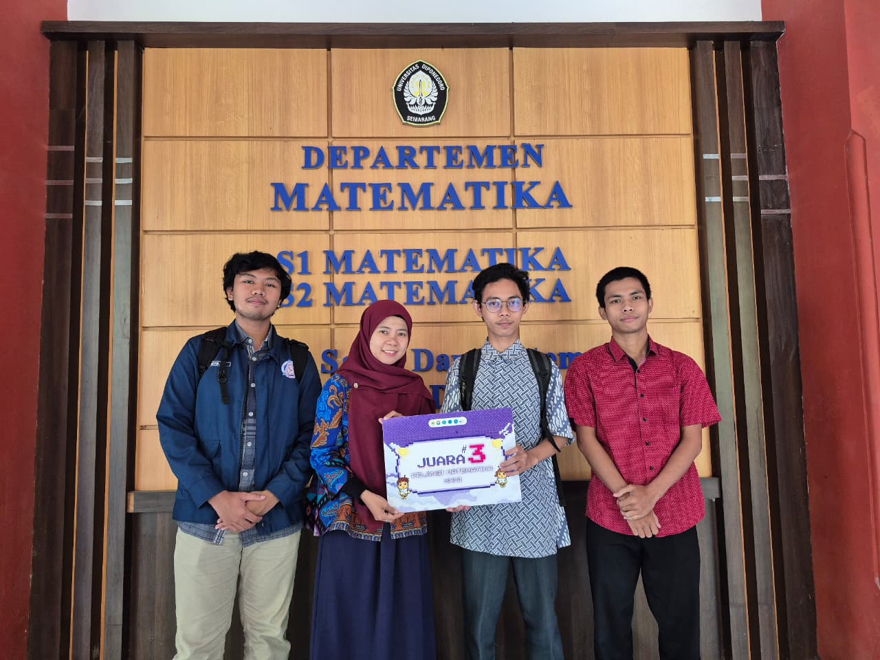 Tim matematika UNDIP yang terdiri dari M. Muwaffaq Azman Ali (24010124120003), M. Ishmatur Roziq (24010124140123), dan Habib Hayub Alfaraby (24010124120027) menunjukkan kerja keras dan dedikasi tinggi sepanjang kompetisi. Kemenangan mereka menjadi bukti prestasi gemilang dan semangat juang yang tinggi. Momen kebanggaan terpancar jelas saat mereka menerima penghargaan serta berfoto dengan penuh percaya diri di depan Departemen Matematika UNDIP.
