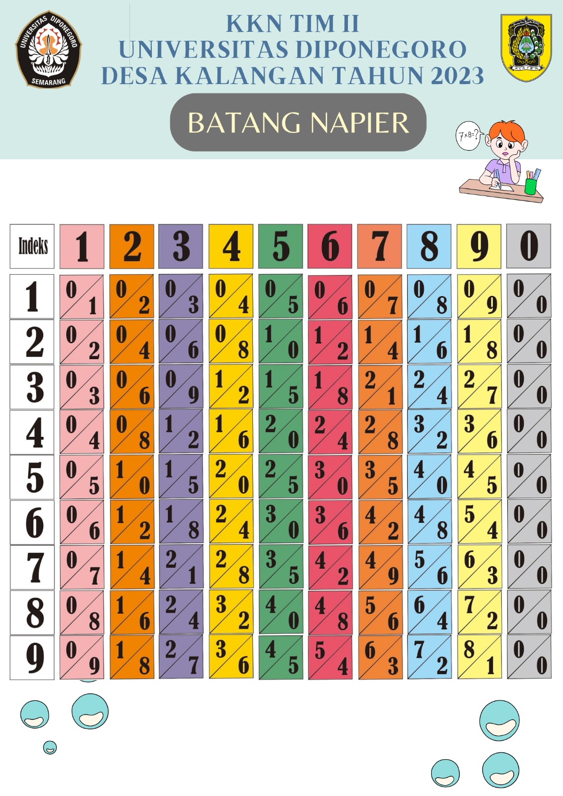Program kerja yang dilaksanakan adalah pelatihan perkalian menggunakan alat peraga batang napier. Pelatihan tersebut bertujuan agar guru dapat mengajarkan kepada siswa cara lain untuk melakukan perhitungan operasi perkalian, serta melatih kerja otak pada siswa dalam mempelajari matematika. Matematika merupakan salah satu ilmu pasti yang menyangkut pola berpikir, bahasa, seni, dan alat-alat. Batang napier sendiri dikenal sebagai salat satu alat yang digunakan untuk proses pembelajaran matematika.