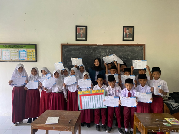 Selain memberikan alat peraga di kelas 6, penulis juga memberikan poster batang napier kepada pihak MI Islamiyah Lolong dan menjelaskan cara penggunaannya. Melalui edukasi ini, diharapkan para murid kelas 6 MII Lolong dapat dengan mudah mengatasi operasi perkalian, terutama perkalian dengan lebih dari 2 digit angka. Mereka akan memahami konsep dasar perkalian dan dapat mengaplikasikannya pada soal-soal yang lebih rumit. Semoga program ini dapat meningkatkan minat anak-anak terhadap matematika.