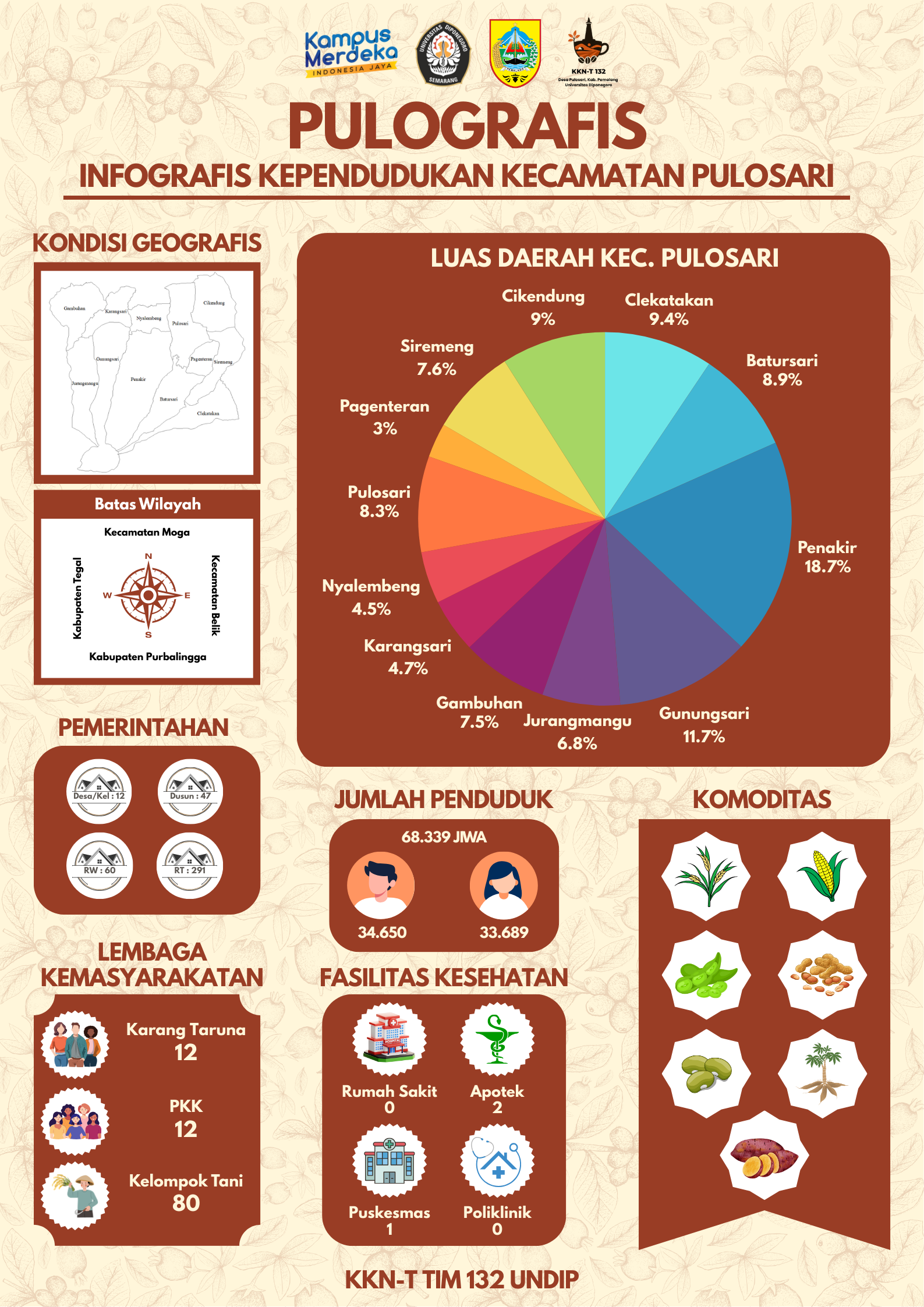 Selain itu, program kerja sosial kemasyarakatan yang diajukan yaitu pembuatan infografis yang memuat data kependudukan terkait Kecamatan Pulosari yang dinamai “Pulografis: Infografis Kecamatan Pulosari”. Infografis ini diserahkan ke pihak Kecamatan Pulosari sebagai media pendukung dalam perencanaan pembangunan serta sebagai komunikasi informasi kepada masyarakat setempat.