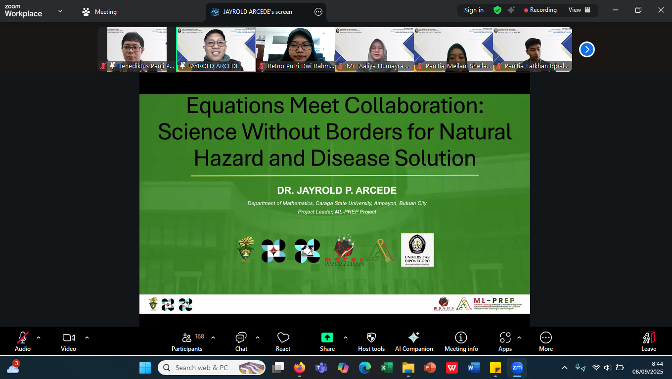 Pada Senin, 8 September 2025, Program Studi S1 Matematika Fakultas Sains dan Matematika Universitas Diponegoro menggelar kegiatan Visiting Lecturer KBK Analisis 2025 dengan tema “Equations Meet Collaboration: Science Without Borders for Natural Hazard and Disease Solution.” Acara yang dilaksanakan secara daring melalui Zoom ini menghadirkan Prof. Jayrold P. Arcede, Ph.D., sebagai narasumber utama yang membawakan materi tentang pemodelan bahaya alam dan penyakit menggunakan persamaan matematis dan analisis dinamis.